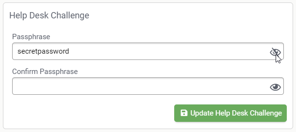 The Help Desk Challenge feature is an additional security layer that allows your support team to verify an end-user by using a call-and-response process. When an end-user contacts your support team the support team can verify the identity of the end-user via a passphrase or a question and answer, which is stored in the user's profile.
