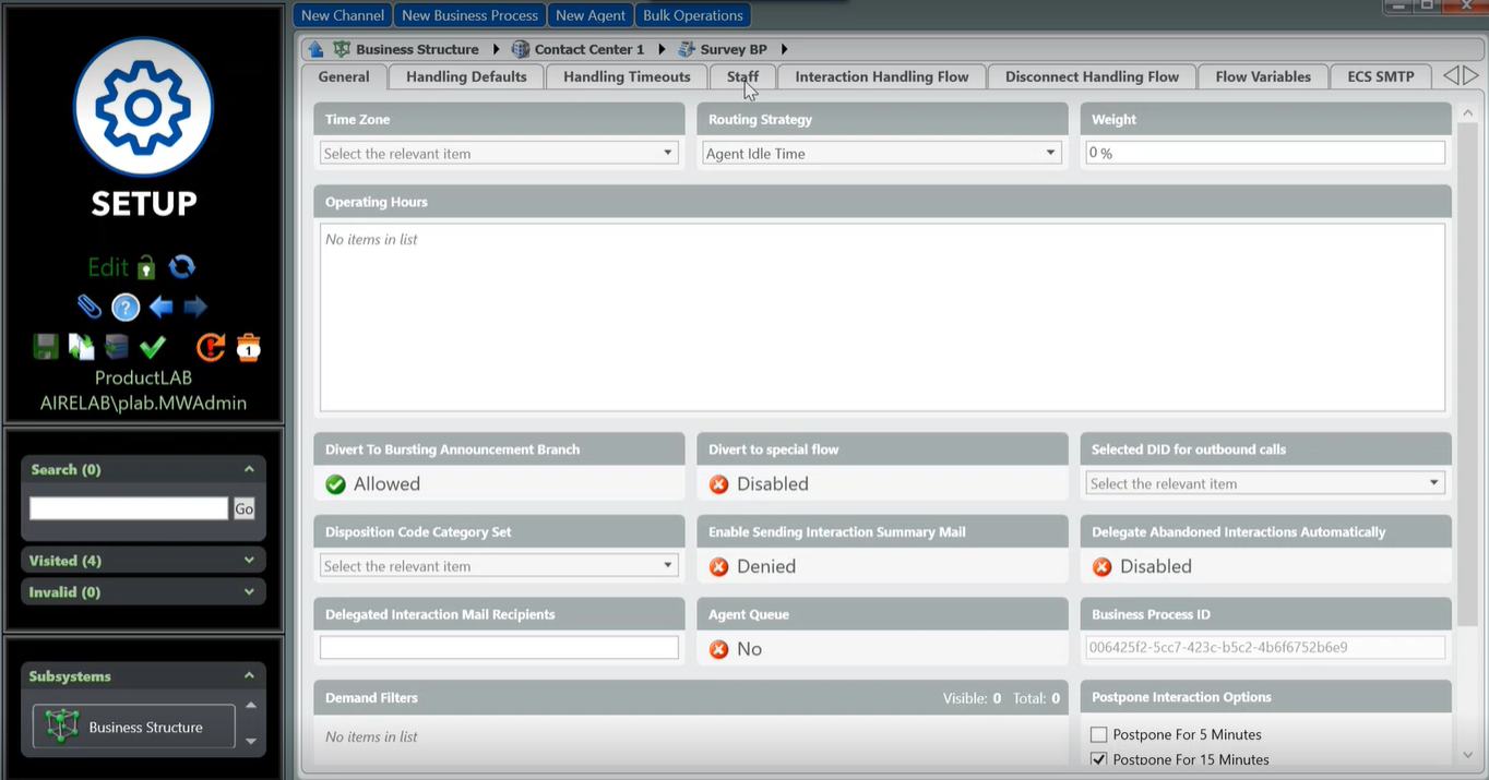 -Select Agents in Staff tab if specific Agents should have a survey initiated with customers who complete interactions in the defined Business Process.