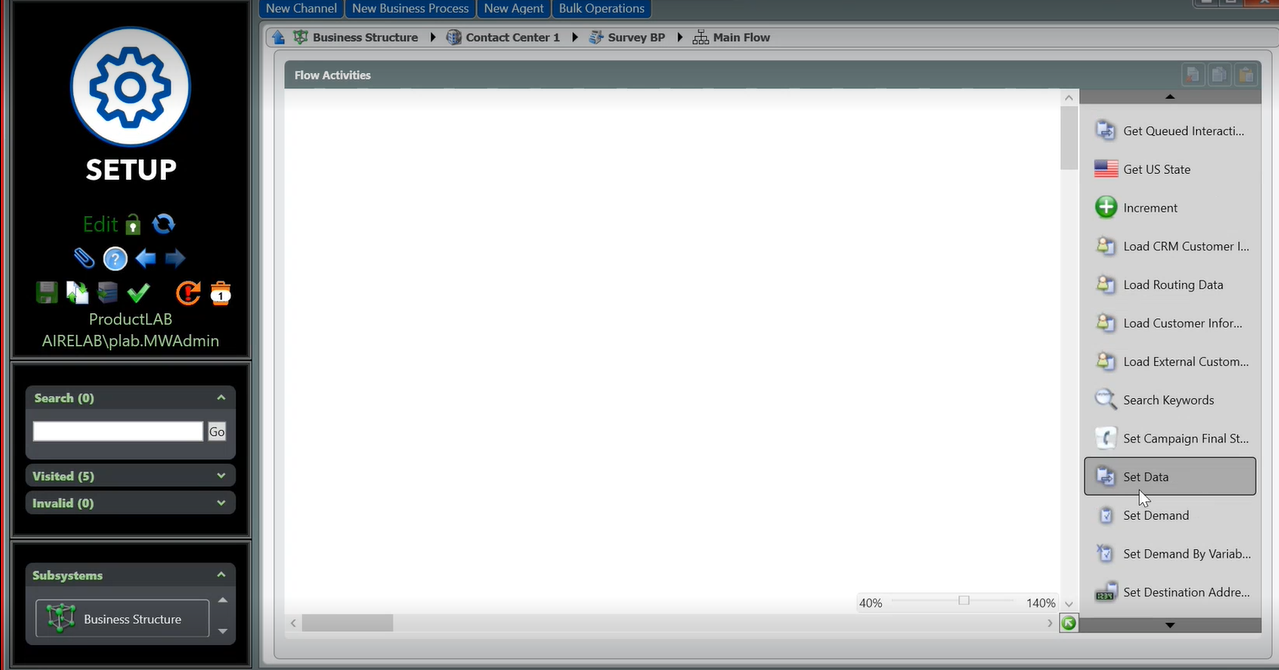 -Edit activity value and name by changing the value to “constant”, selecting Survey and Survey name, and name survey activity.