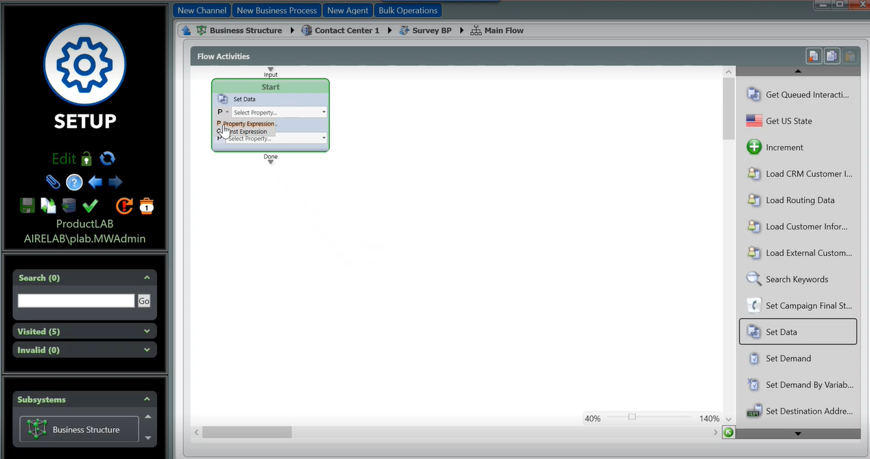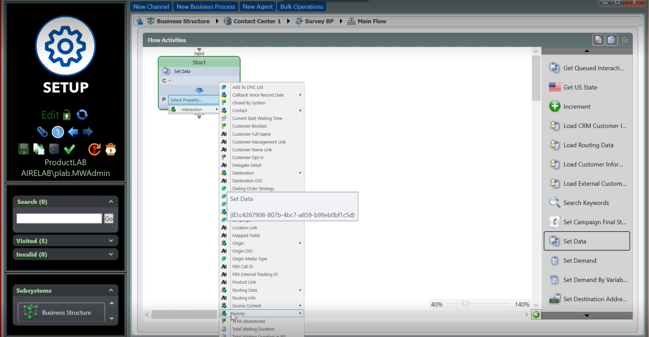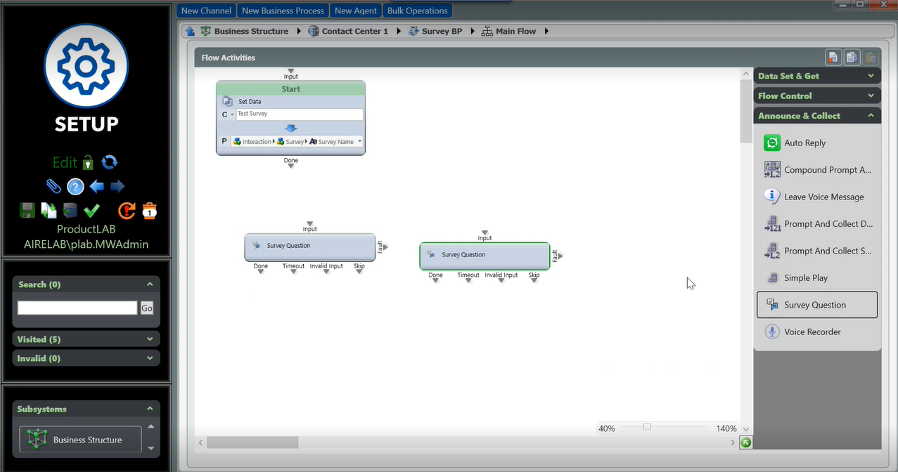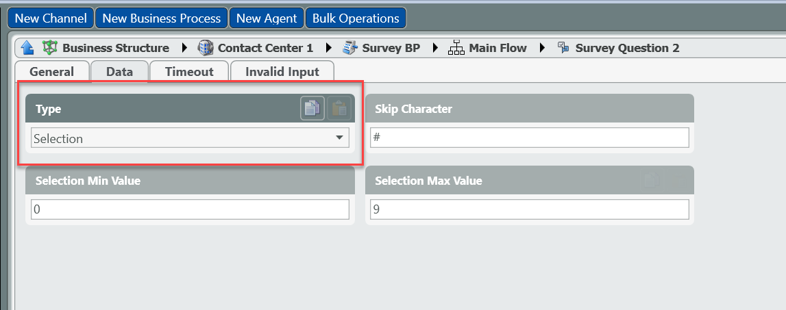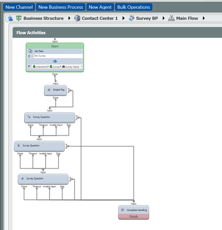 A new “Survey” Business Process should be created which will act as a hub for a Business Process survey. The survey included in each "Survey" Business Process can include different questions. Therefore, a new "Survey" Business Process can be set up for each independent survey. If using more than one set of survey questions additional logic will be required directing the caller to the relevant set of questions based on the Business Process the customer is in when opting into the survey. If the same survey is used across multiple Business Processes, the applicable "Survey" Business Process can be selected in Set Post Agent Handler within each Business Process.