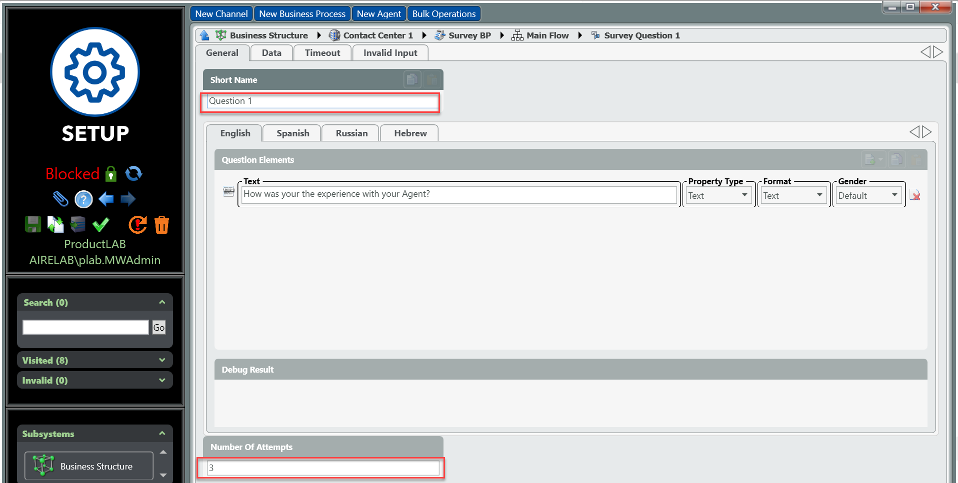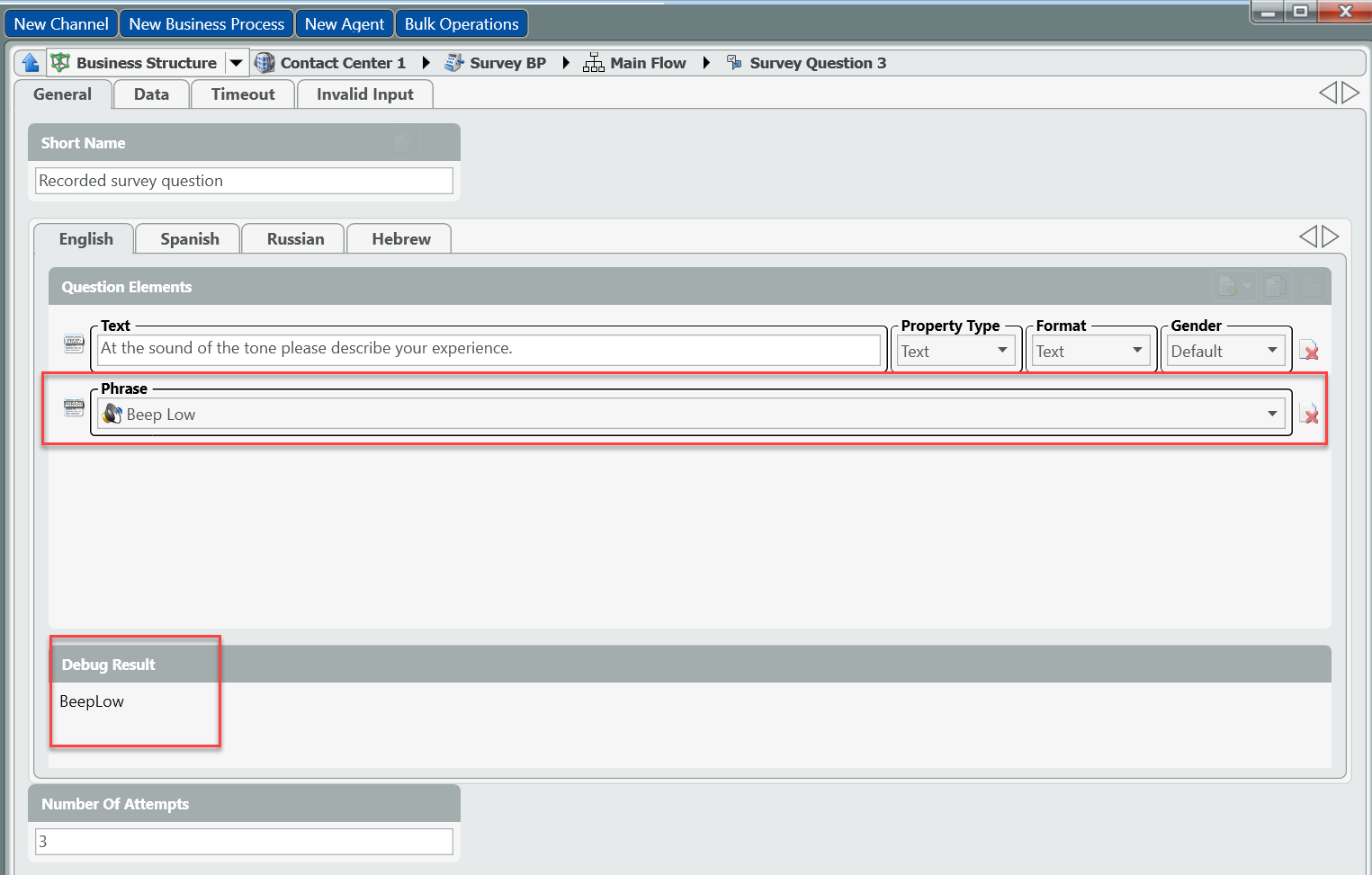 -Customize each question. This allows each question to include a short name used as a survey question. This is the audio content that will be used for the question. It is also the identifier for reporting.