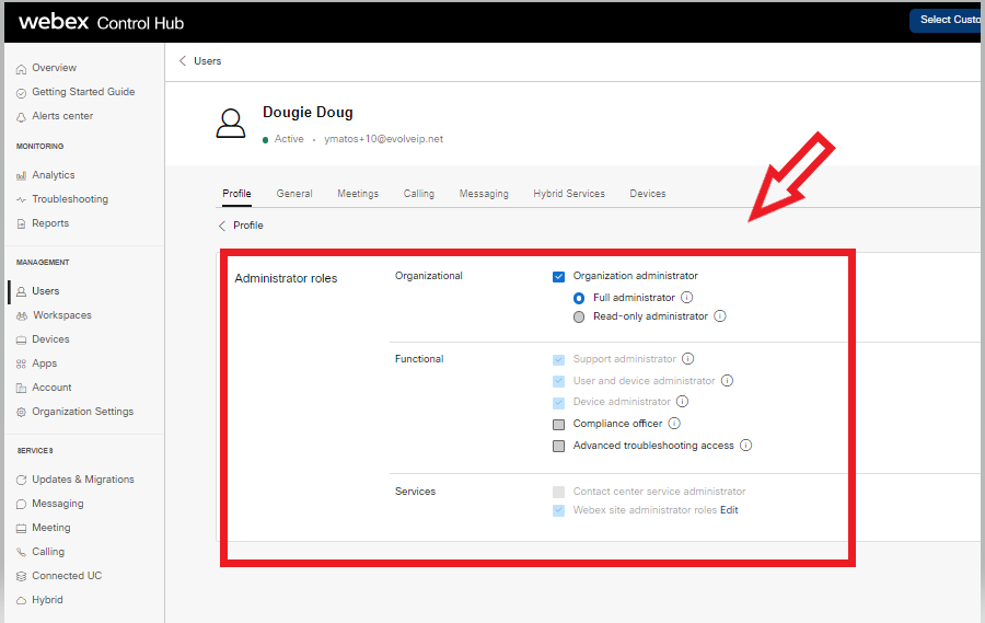 Each role determines the privilege level you have in Control Hub. If you have full administrator privileges, you can assign one or more roles to any user in your organization.