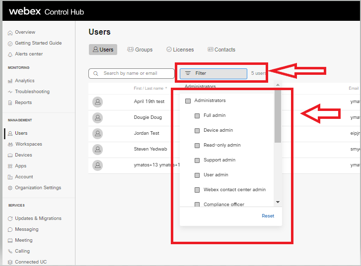You can set up users in your organization with different administrator roles. Users can become full administrators, or a combination of support administrators, user and device administrators, device administrators, read-only administrators, or compliance officers. You can also see a list of all or specific administrators in Control Hub, including device administrators and compliance officers.