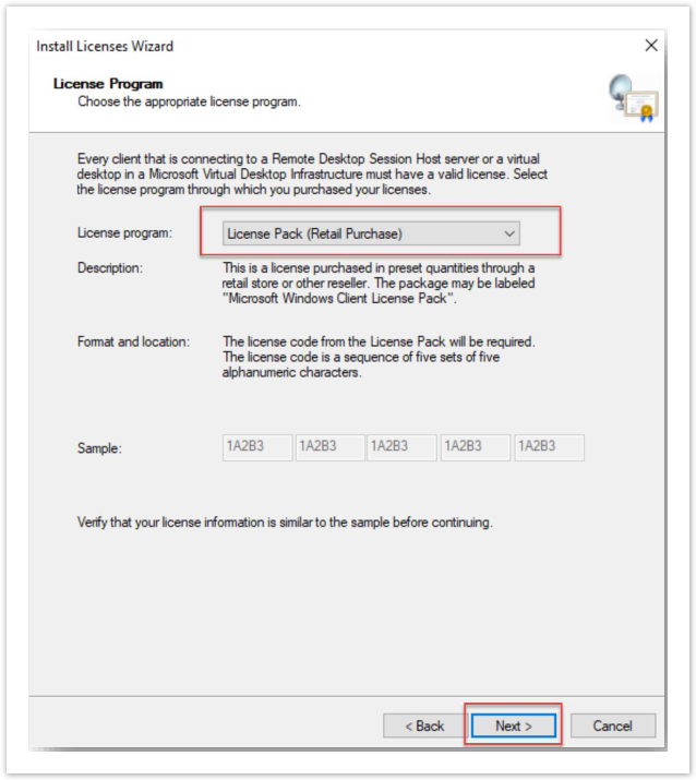 From the License Program drop-down menu, select License Pack (Retail Purchase)