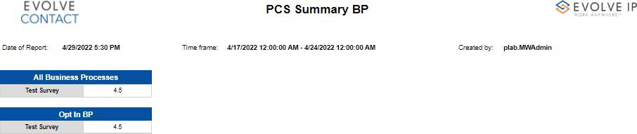 Provides the average scores for a Post Call Survey across all Business Processes and/or a specific Business Process