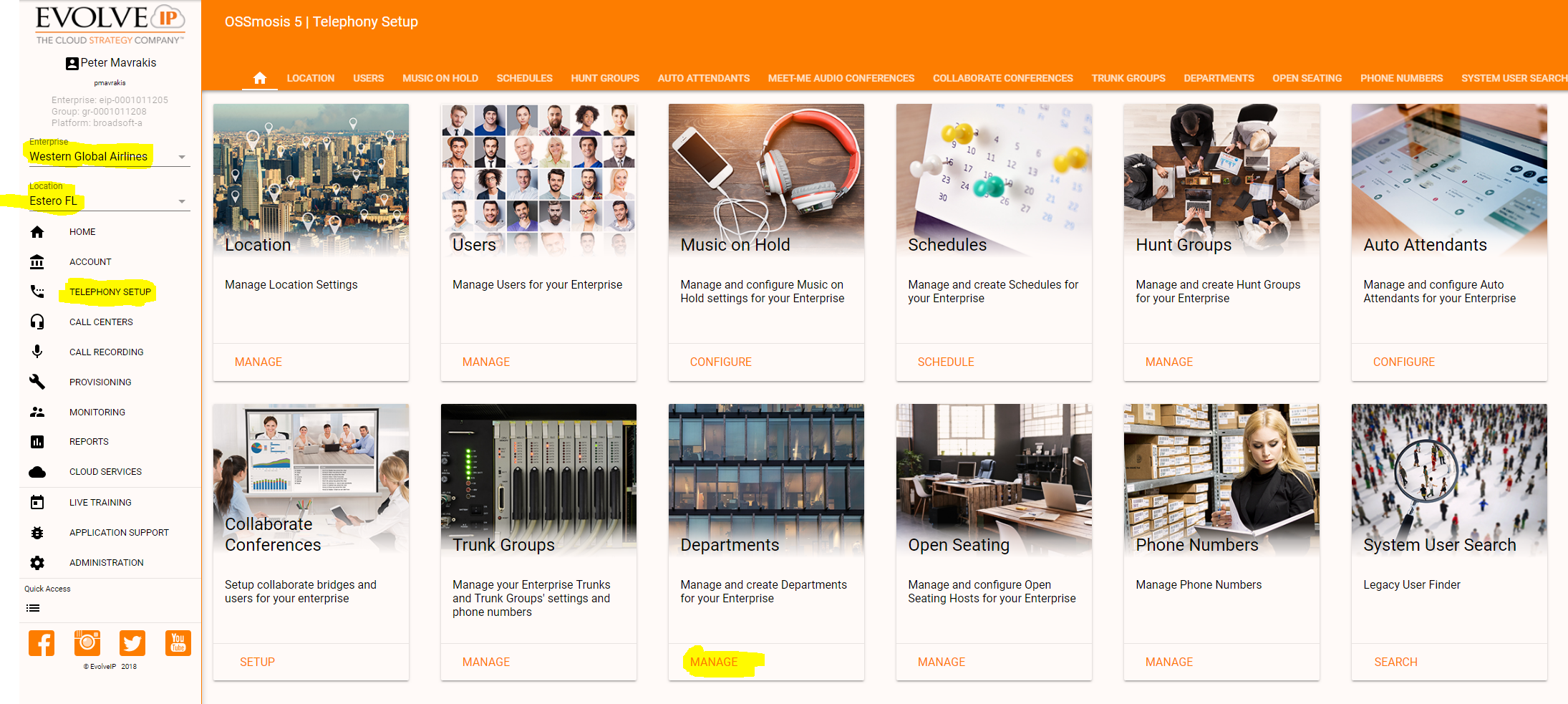 Click on 'Telephony Setup,' and click on 'Manage' under Departments