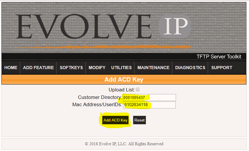 Type in the Customer's enterprise number in the Customer Directory field, and the User's ID in the Mac Address/User Ids field.