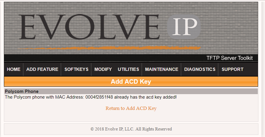 If you get a message saying similar to the one on the left, tell the user the ACD keys have already been added, and they need to reboot their phone.