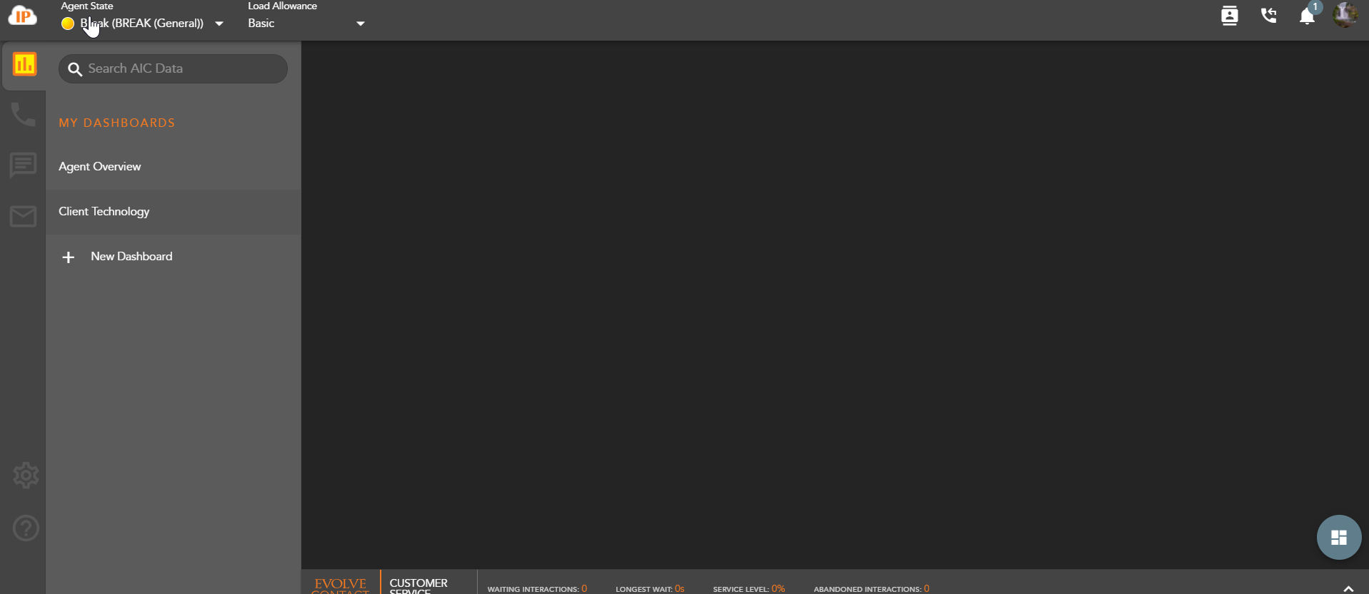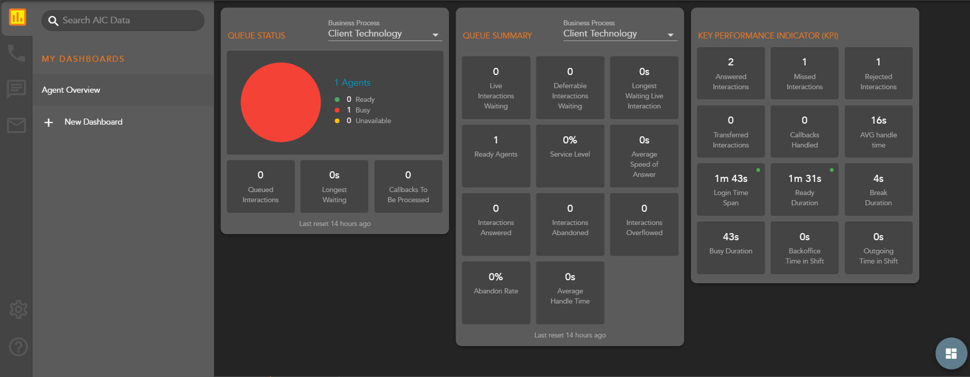 The AIC allows for agents to have multiple Dashboards. This provides agents the ability to customize different dashboard views and the cards within those views. Agents can have multiple dashboards and easily navigate between the views.