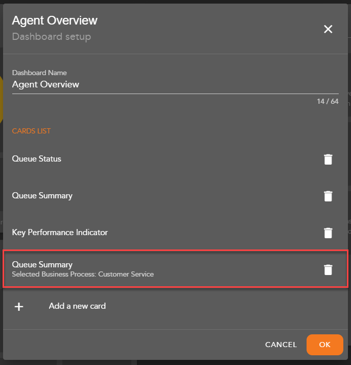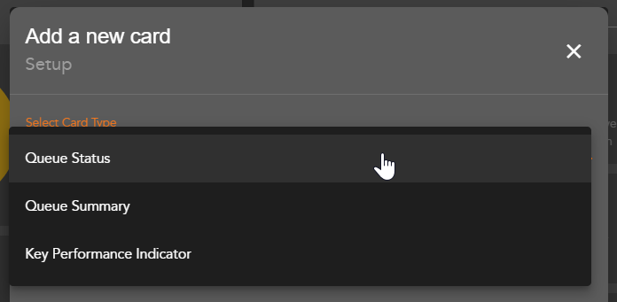 . When selecting this option, the edit Dashboard window will updayr to allow for adding a new cardFrom the Select Card Type drop down select to add a Queue Summary, Queue Status Card or Key Performance Indicator (KPI) Card.