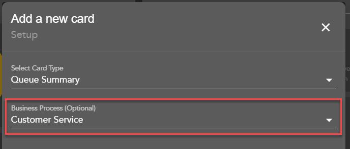 . Select to add the card to your Dashboard view. Once created the Dashboard edit window will update to show your newly created card. The new card will show the selected Business Process if added on card creation.Note* - When a card is created to show a specific BP, you will be unable to adjust the BP chosen in the main Dashboard view. The Business Process drop down will be grayed out