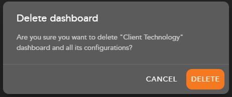 A confirmation pop up will ask you to confirm you want to delete the dashboard. Select Cancel to cancel the deletion of the dashboard or Delete to confirm you wish to delete the dashboard.