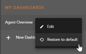 After making changes to the default Agent Overview Dashboard view, you can choose to restore the view to its original format. The original format would include its original title (Agent Overview) and just one Queue Status, Queue Summary and Key Performance Indicator (KPI) card. To restore to the default view, select menu options in the dashboard panel next to the dashboard and select Restore to Default