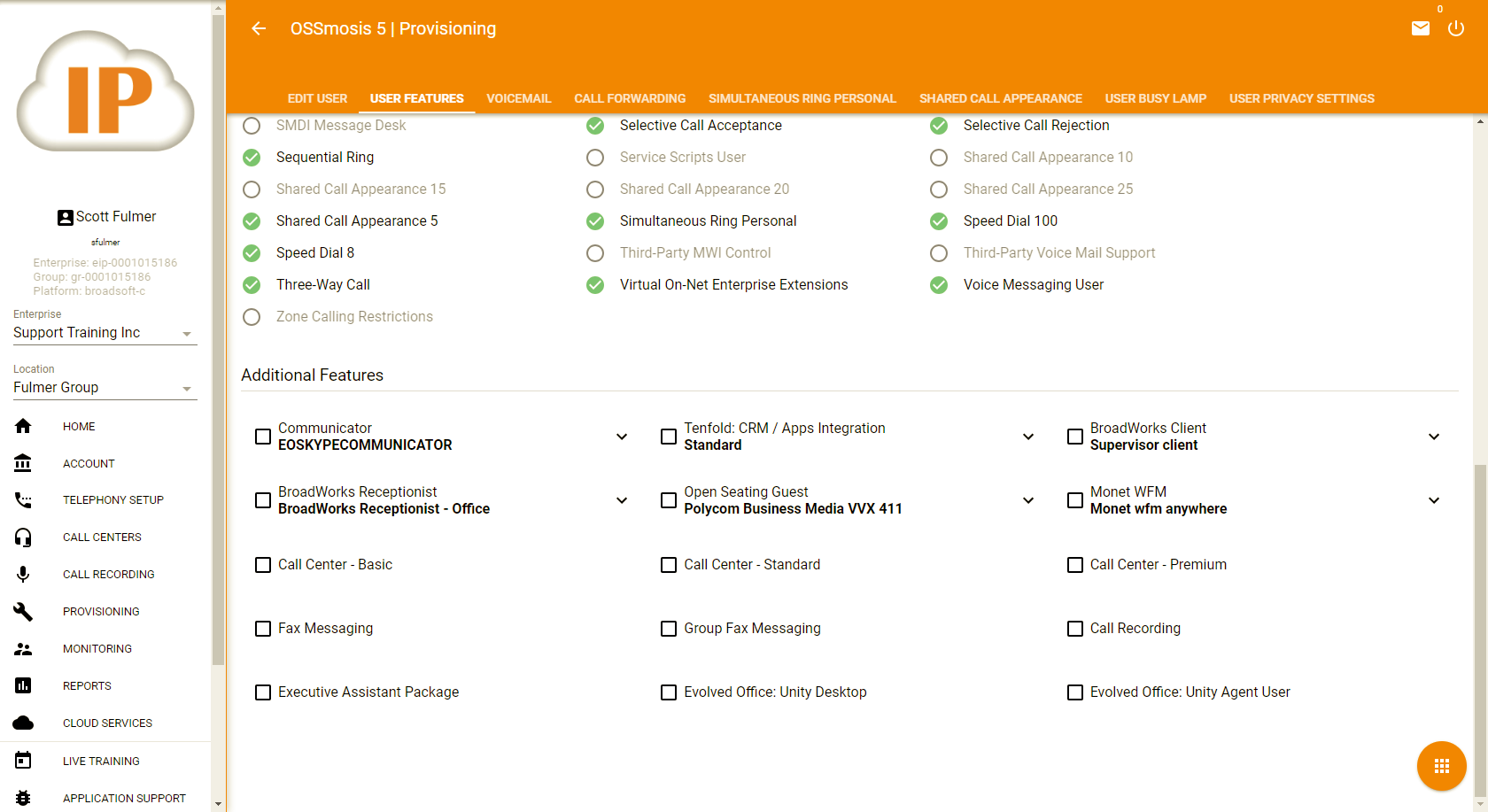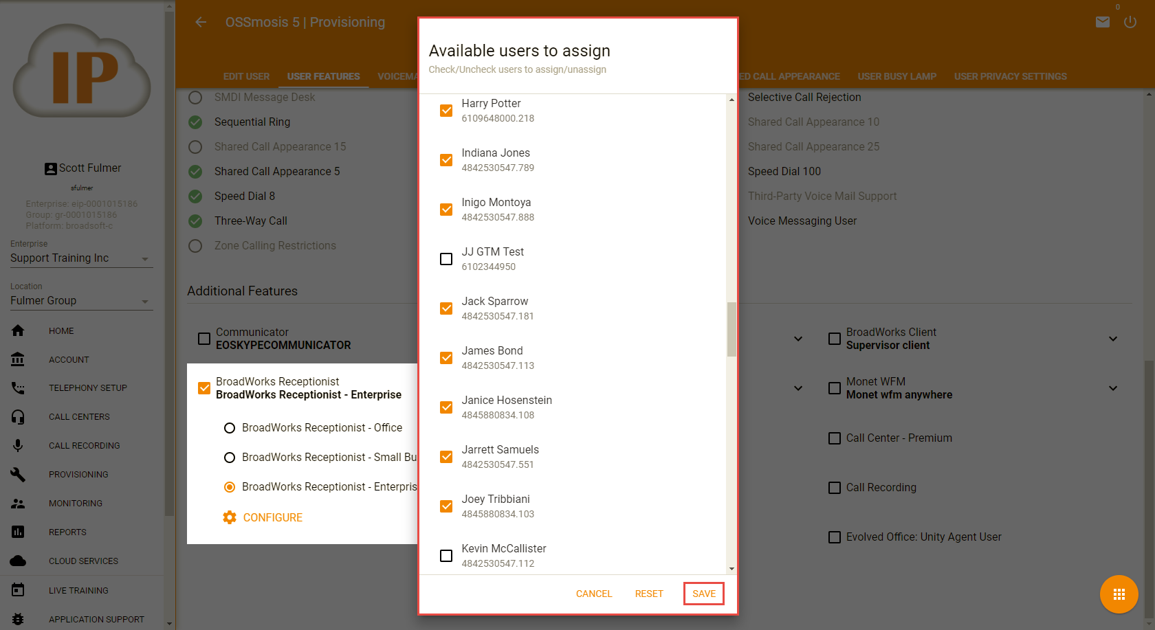 Check the box next to each user the receptionist would like to monitor. If 'Enterprise' or 'Unlimited' is assigned, you can check the box next to 'Select All' at the top to assign every user within the enterprise to the Receptionists license for monitoring.