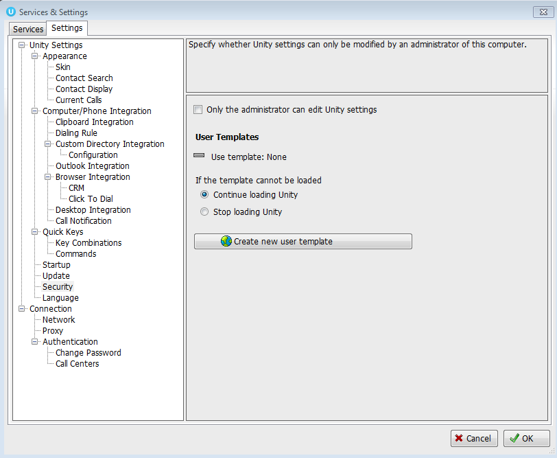 Unity allows administrators to configure and control Unity settings and prevent unauthorized changes by an end-user. Through the use of Unity’s template feature, one or more collections of Unity settings can be created. For instance, one group of settings might be used by the “Customer Service” team while a different set is used by the “Billing” team.