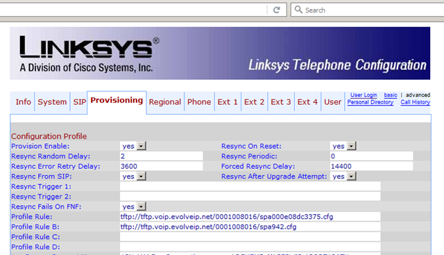 Cisco/Linksys SPA phones will need to have the appropriate urls entered via the phone's web gui (see screenshot below) in order to instruct the phone on where and what to pull for configuration. The web gui is accessible when proxied through the Edgewater.  (reference: PuTTY: How to use PuTTY to Proxy inside of LAN via SSH) There are 2 urls required for these phones.  An example of the urls to be entered is tftp://tftp.voip.evolveip.net/0001009299/503DE50F084A.xml & tftp://tftp.voip.evolveip.net/0001009299/spa525system.xml.