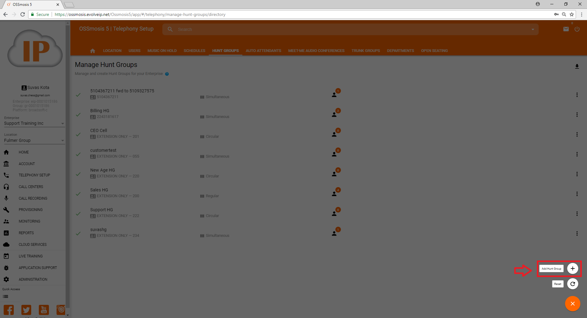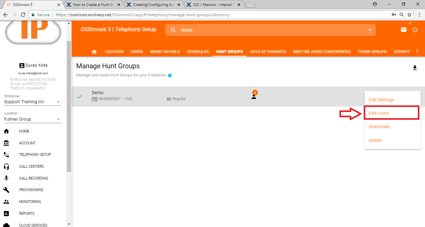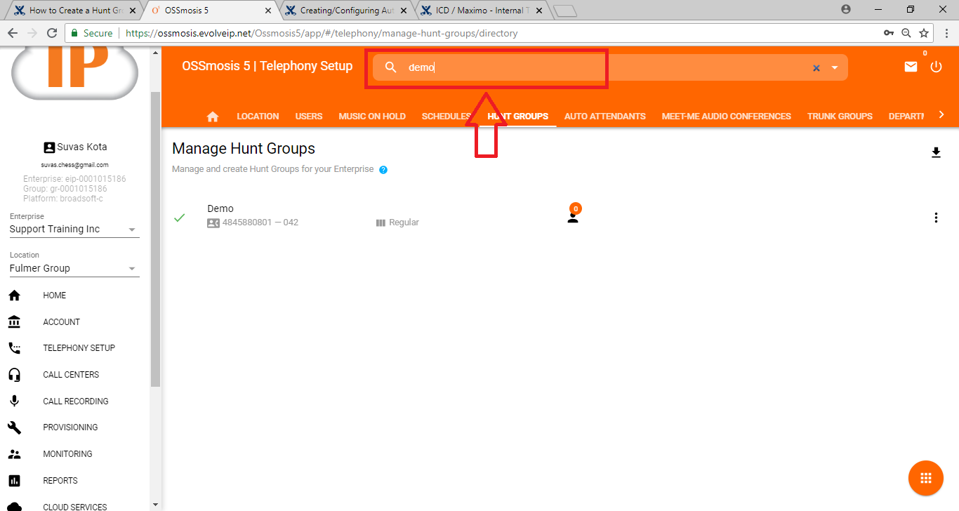The Hunt Group has been created but users need to be added so in the seach bar, look the Hunt Group up
