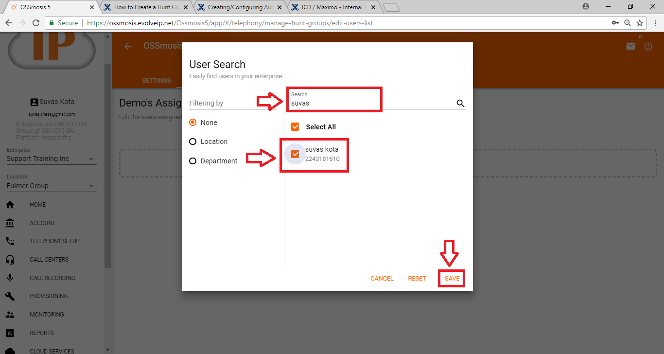 Search for a user using the search bars and filters and then check mark the box next to the user and then select save. If you want to add a group of users at once, then after you select the check mark in the box next to the user, search for the other users and put check marks next to the users' boxes and then select save. This will create a functional Hunt Group with users in it
