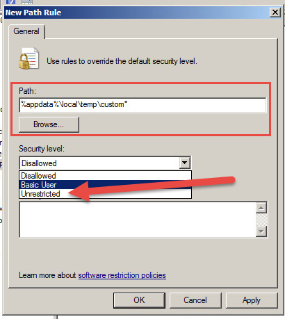 Configuring this policy will often times take some custom configuration because each environment has its own set of software that users need to be able to install and/or launch.