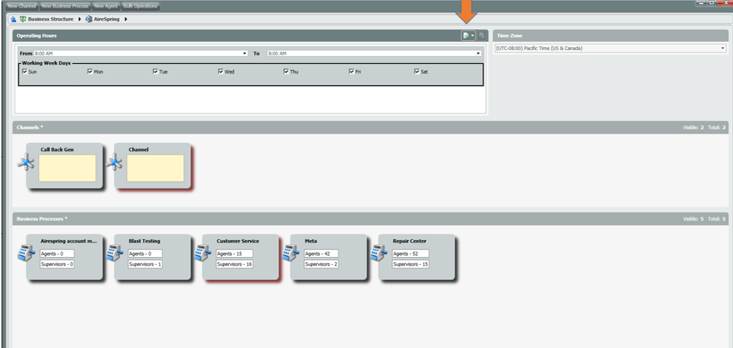 You define the Contact Center's operating times in the Operational Time section. A contact center's operational times are defined for every day of the week