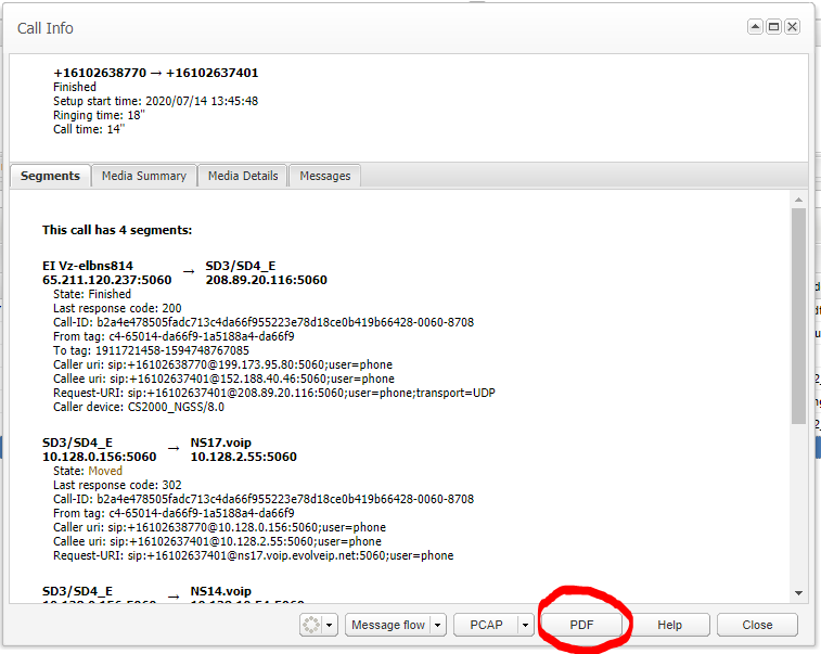 Once your call example legs have been found in OCOM, click on the PDF button when viewing the call information.
