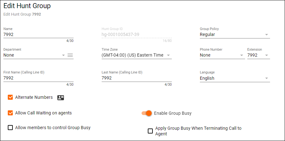 - Apply Group Busy When Terminating Call to Agent – calls made through a directory hunting number are not affected by Hunt Group Call Busy if enabled
