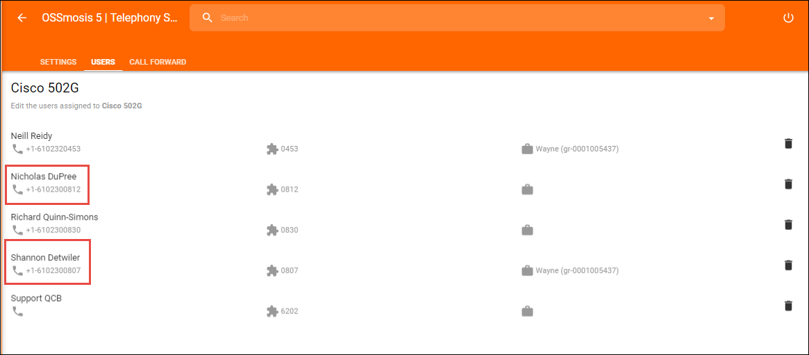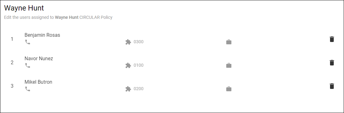 - To remove a user from a hunt group, select the Delete Icon next to the users name.