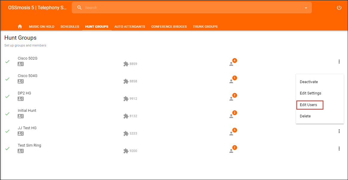 - From the Hunt Group landing page, select the Additional Options icon and Edit Users