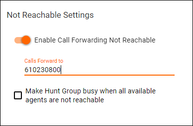 - Enable/Disable – Call Forwarding Not Reachable/Forward To – If the Hunt Group becomes not reachable, the caller will be forwarded to the DID, extension or voicemail entered. A voicemail is designated by putting *55 before the extension – example: *558001