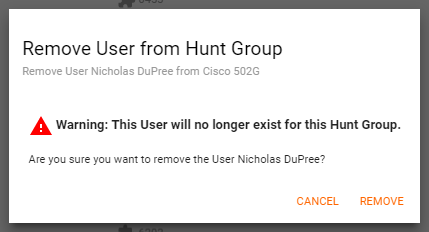 - A confirmation popup window will open to confirm the removal of the user. Select remove if you would like to remove the user from the hunt group or cancel if you would like to keep the user in the hunt group