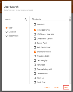 - Locate and select users in the advanced search by User, Location or Department. Save.