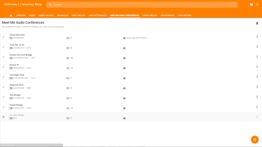 - Active/Inactive– A green check mark indicates the Meet-Me Audio Conference is currently active. A red X indicates the hunt group is currently inactive.