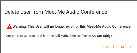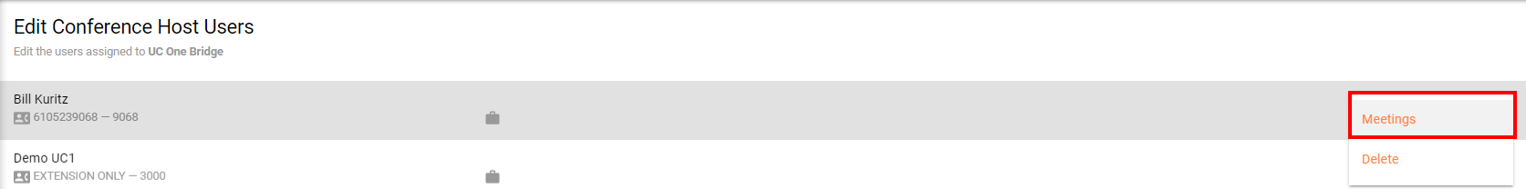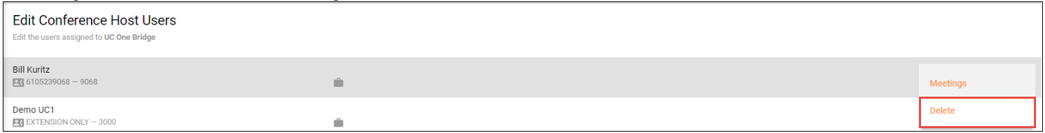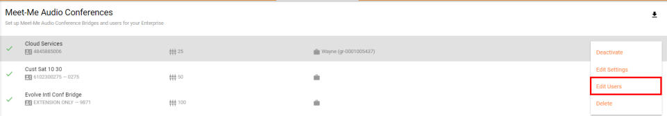 - Additional Options– Select the options icon allows Admins to manage the Meet-Me Conferencing settings: Deactivate, Edit Settings, Edit Users, and Delete.