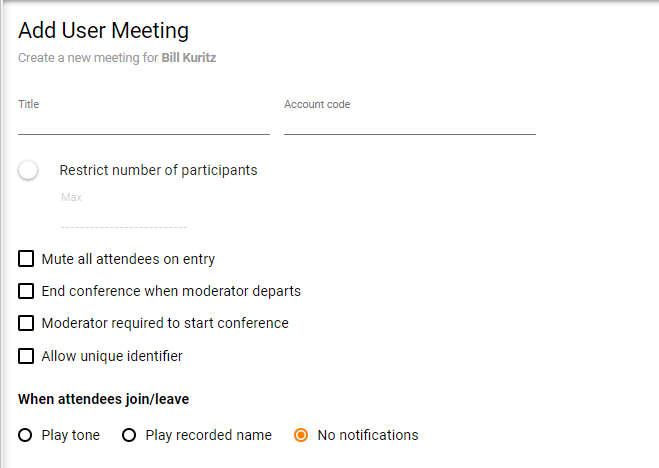 - Department (Briefcase icon) – Apply a Department name to a Meet-Me Audio Conference (optional).