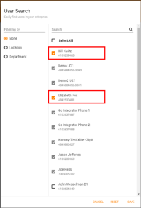 - Locate and select users in the advanced search by User, Location or Department. Save.