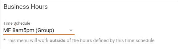 The After Hours menu allows Admins to configure the greeting and menu options presented to customers when they call outside of their normal business hours of operation – after hours. A business hours time schedule is applied in the After Hours Menu. The After Hours greeting will play outside of the hours defined by the time schedule