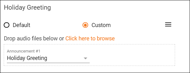 - Custom – Select custom to add a custom WAV/MP3 file for the Holiday Greeting