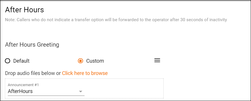 - Custom – Select custom to add a custom WAV/MP3 file for the after hours greeting