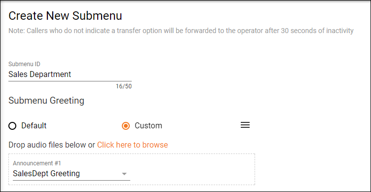 - Custom – Select custom to add a custom WAV/MP3 file for the Submenu Greeting