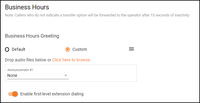 - Custom – Select custom to add a custom WAV/MP3 file for the business hour greeting