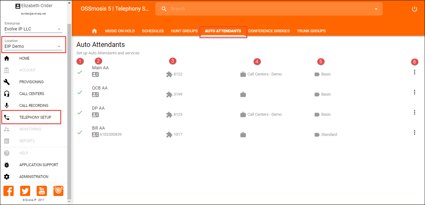 Select the location you wish to view and edit. Select Telephony Setup and Auto Attendant to bring up Auto Attendants for that specific location.