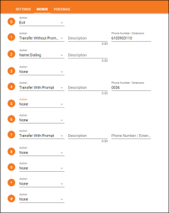 Admins have the ability to change the menu options and manage the action, description and where calls are transferred to, if applicable. The greeting played to customers should match the order and destination of the AA menu. If the order and destination of the menu changes, a new custom greeting should be added. Below are a list of all Actions available when setting up an Auto Attendant.