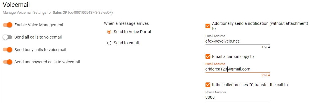 Send to Email: This option will only send the voicemail in the form of a WAV file to the specified email address and it will not be kept in the voice portal. When Send to Email is enabled, an email address field will appear to enter a valid email address for voicemail’s to be sent.