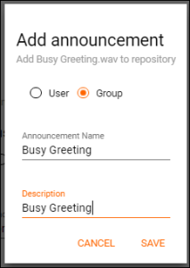 When the file has been added a popup window will appear to provide a description and select whether to add the announcement to the User or Group Announcement Repository. If added to the User Repository the audio file will only be available to the end user that added it to the repository. If added to the Group Repository the audio file will be available for use to any end user within that group/location and select Save.