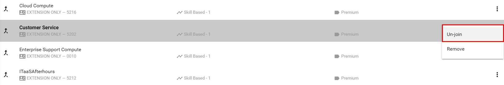 1. To Remove or Join/Un-join the agent from the queue, select the Options Icon and then select the action from the menu. Agents need to be both Assigned and Joined to a queue to receive those calls when they are in the Available state. If an agent is Unjoined from a queue, they are still assigned to that queue but are not actively participating in that queue when they are in the Available state.