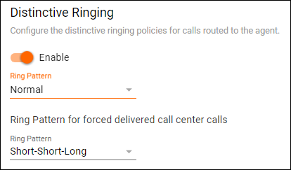 There are two type of distinctive ringing policies that can be setup, regularly delivered queued call and forced delivered queued call. With distinctive ring patterns the agent will be able to differentiate which type of call is being delivered to them.