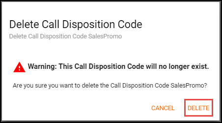 3. A verification popup will ask if you want to continue and delete the disposition code. Select delete.