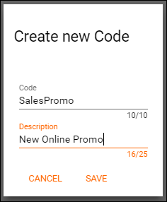 2. In the Create New Code popup add the new code, the description, and select Save. The code is what will show up in reports and be available to agents to apply to a queued call. EvolveIP’s best practice is to not use numbers or letters as the code but something instantly recognizable when looking at a report. Example code: NewPromo or NewSale