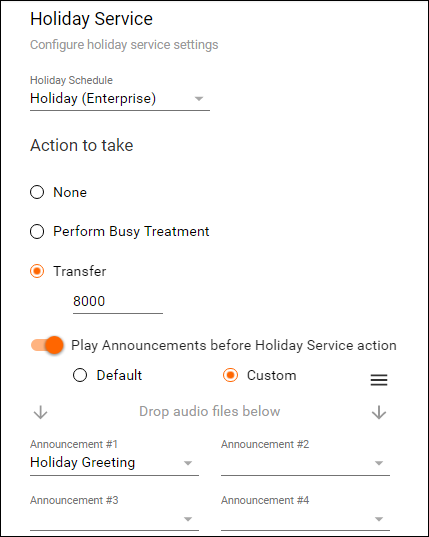 - Play Announcements before Holiday Service action: An announcement(s) will play to the caller before the Holiday Service action is taken.