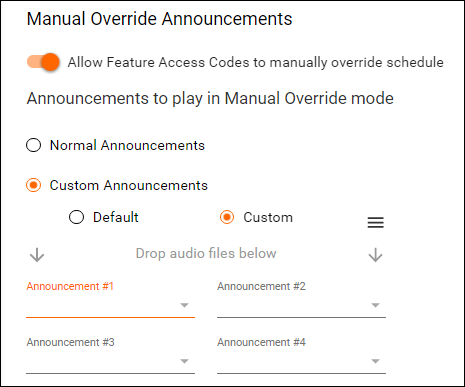 - Announcements to play in Manual Override mode: When a call center has activated Night Service Override, the Normal Mode Announcement selected in Night Service can be played for the caller or you can choose Manual Mode Announcement to select a different announcement(s) to play when the call center has been forced to Night Service manually